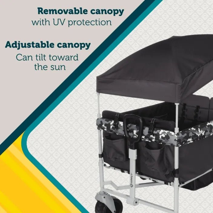 Wagon features a removable canopy with UV protection and adjustable poles that tilt, 1-hand fold for quick and easy storage.